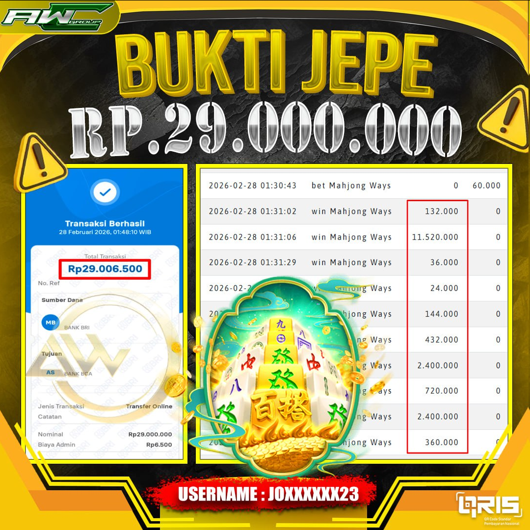 ID : JOXXXXXX23 JACKPOT PAUS DI SLOT PG SOFT NAMA GAME : MAHJONG WAYS TOTAL WITHDRAW : 29.000.000